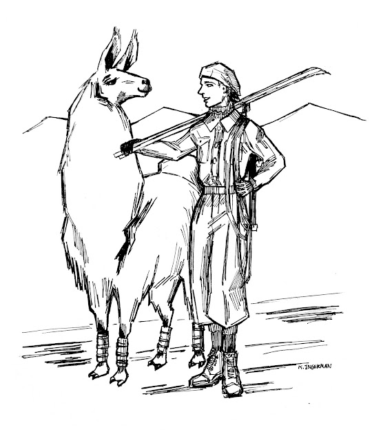 Bob is keeping warm in wool plus fours, a turtle neck sweater and a jacket. Both his look and pose are inspired by the beautiful 1930s fashion illustration on the right. Instead of ski poles, though, Bob is carrying a leather harness, and the llama has on his protective leather sport boots; ready to lead his friend through the powder! Next I will have to finish a color illustration of skis, harness, llama, and Bob, all working together.